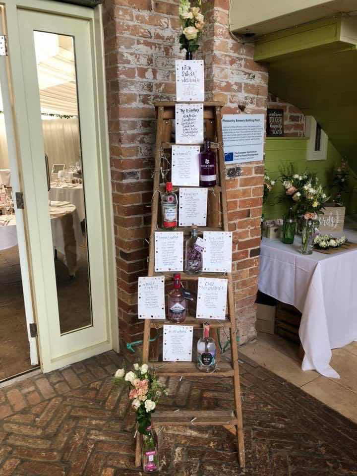 Obviously with centre pieces, comes a table plan! And one of the reasons we needed the extra bottles was to use one on the ladder which the table plan was built on so people knew which Gin bottle they were looking for. This was hands down one of my favourite parts of the Venue!